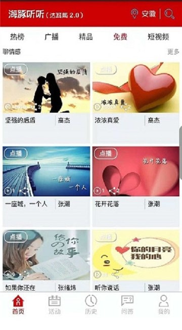 海豚听听下载安装是一款影音类的软件,其提供了热榜、广播、精品、免费、短视频五个模块,智能提供热门的榜首视频或节目,根据广大人民的点击量、搜索流量进行推荐,实时更新,致力于为用户提供最热最新的节目;还能显示在线观看的人数,与兴趣相投的人一起观看视频、一起互动;用户不需要付费,就可以享受免费的视频,点播心仪、喜欢的节目,即可为您服务,各种各样的视频任您选择,情感节目、热血视频、广播电台等都可以随心所欲的点播,为您提供优质的服务。
