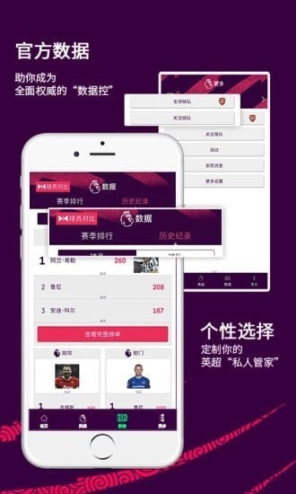 5.排行阵容:球员排行,阵容展示,纵横英超赛场。