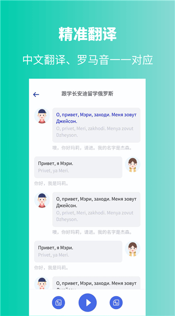 通过常见的俄语学习场景,从俄语字母开始学习,匹配真人教学视频和俄语翻译,