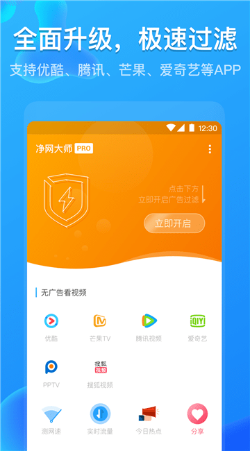 净网大师app是一款安全防护软件,支持优酷、腾讯、芒果TV、爱奇艺等app拦截广告无广告看视频,一键拦截视频片头广告让你追剧更流畅更舒心,火爆综艺热播剧推荐,热门视频一键直达,想要无广告看视频追剧,快来下载使用净网大师app吧!