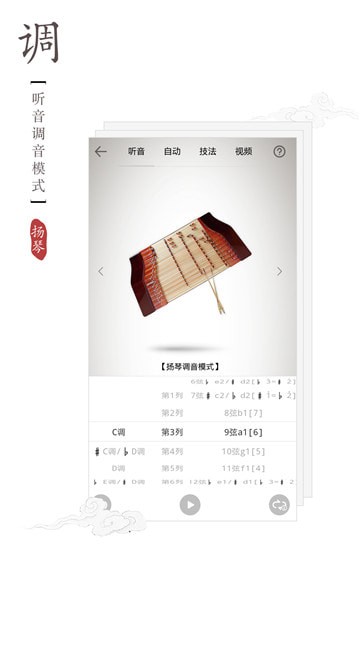 扬琴调音器app是一款手机扬琴调音软件,用户可以自由切换听音调音模式、自动调音模式、扬琴常用技法、名家视频教学软件,帮助用户更轻松便捷使用手机调音,帮助完美掌握节拍器功能,不懂得朋友可以看视频边看边学,轻松学习扬琴,有需要的朋友快来下载使用吧!