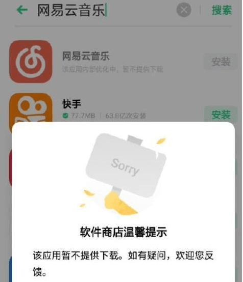 到目前未知,手机端的各大应用商店都已无法下载网易云音乐APP,但苹果端的AppStore仍然可以继续下载,对此应用商店解释说道:根据相关法律规定,该应用内部优化中,暂时不提供下载。