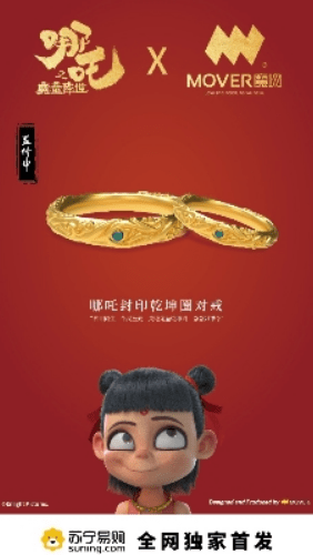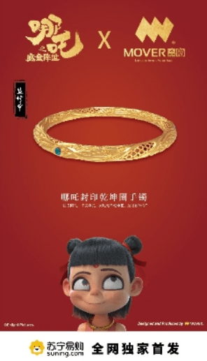随着影片的迅速走红,以“哪咤”形象衍生的正版周边产品也相继出炉。9月9日,Mover魔吻联合苏宁易购,携哪咤正版授权首饰震撼来袭。