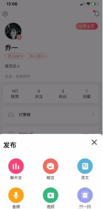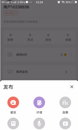 在“我的”界面,右下角,有一个红色的加号,点开就是发布选项,里面有六个选项,也就是上面说过的暖言、评理等,点开即可进行发布。