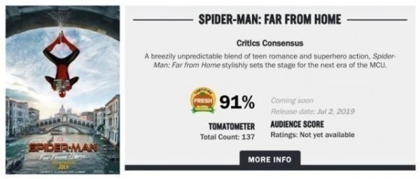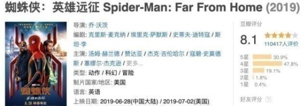 所以不管在烂番茄的评分,还是豆瓣的评分,《蜘蛛侠:英雄远征》都处在很高的分数线。