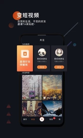 变短视频是一款好玩的短视频App。丰富精彩的热门视频,看不停;好玩有趣的拍摄,拍不停;独特的蟠桃商城,上千种商品免费兑换;商家免费霸王餐,送不停!变短视频,show出我的百变生活。