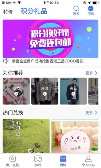 商城,查看大量的商品信息,选择需要的商品进行兑换;