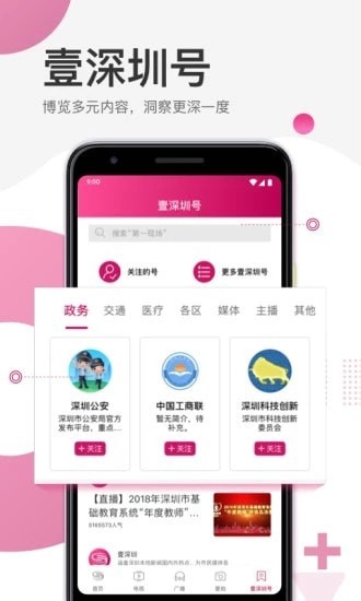 “壹深圳”是深圳广播电影电视集团媒体伴随客户端,功能涵盖深圳本地新闻及国内外时事热点资讯发布,为鹏城市民提供各类生活引导服务及媒体互动,打造一个“手机看直播有事记者帮互动抢好礼”的综合型服务客户端。