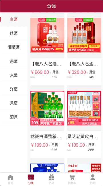 涵盖白酒、葡萄酒、啤酒、洋酒、黄酒、保健酒、酒具等,满百包邮,