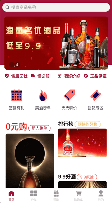 酒咖网开设白酒专区、红酒专区、整箱购、老酒味道、清仓名酒、新品首发等精品频道,
