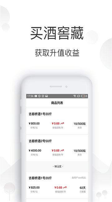 时间仓商城安卓版是一款功能非常优秀的为用户提供白酒线上购买服务的掌上移动平台,软件内支持用户线上购买、存放在平台上面,白酒存放的时间越久,白酒增值的幅度越大哦,有需要的朋友赶快来下载使用吧。