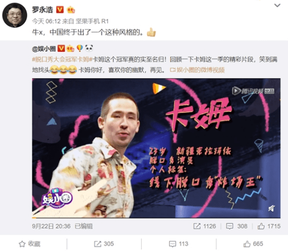 9月24日消息,锤子科技CEO罗永浩为脱口秀冠军卡姆点赞:中国终于出了一个这种风格的。