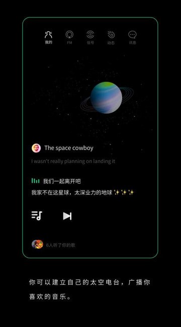 space fm是一款收音机一般的宇宙电台软件,我们每个人都是星球上的宇航员,你可以发出自己喜欢的音乐频道,和朋友们互相交换喜欢的音乐以及秘密心事,在这个浮躁的世界里,来宇宙上我们一起乘凉吧!