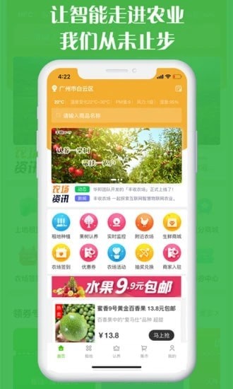 丰收农场app是一款农场租地种植、农业认养、畜牧领养、可视化农业直播、物联网农业、农业电商商城等等为一体的智慧农业移动互联网解决方案,目前丰收农场软件解决了城市人体验农村种植、养殖的生活,通过丰收农场app足不出户在家就可以租地种植自己的蔬菜了,养殖鸡鸭牛羊,用户通过丰收农场监控直播实时查看自己种植的菜地,自己种自己吃。