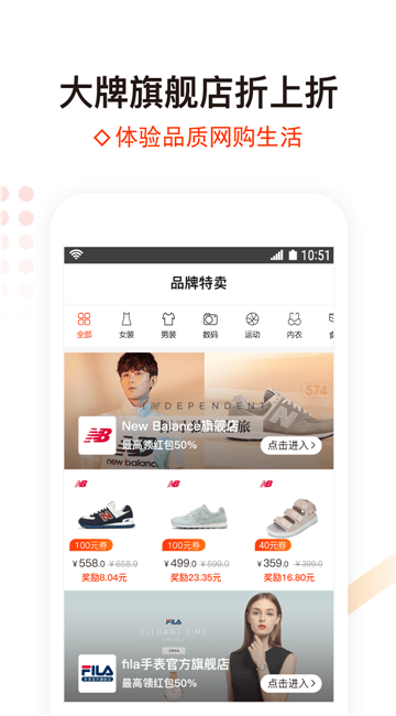 3,品牌热卖,每天上百款品牌商品专区;知名品牌,美食,美妆,家居,配饰,数码,服装等