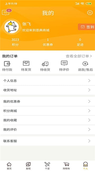 个人选项可查看个人信息,地址,评价,优惠券,订单信息等。点击右上角设置按钮,可设置,头像,地址,生日。邮箱等信息。
