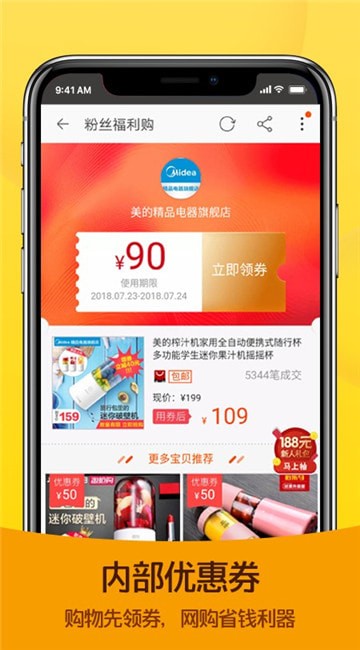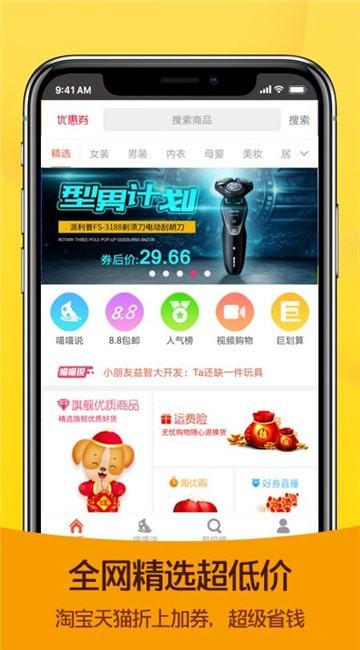 【商城】拥有上千万品牌商品。女装、男装、化妆品、鞋包、数码、家具、超市、聚划算、母婴、文具、面膜、书籍、家电、零食等数百种品类折扣优惠券,购买享受更低的价格,买到你相中的品牌,让顾客轻松一站式购物。让你更省钱、更方便!比双十一还划算!手机淘宝优惠券是你海淘、网购的省钱神器,赚钱能手!