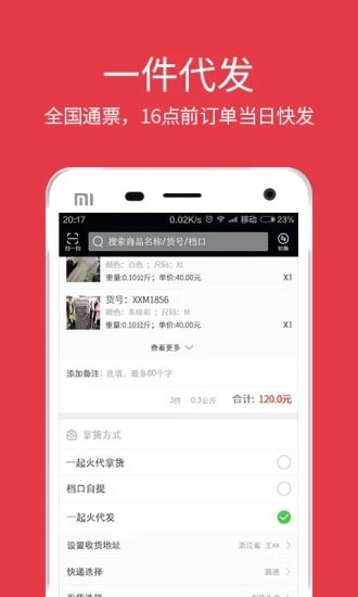 一起火app是一款专注于服装批发所打造的采购商城,为你整合了一起火服装批发的所有货源,直接涵盖有杭州四季青服装批发市场、广州沙河批发市场的女装货源、男装批发等服务,完全可以帮助广大中小型淘宝店主、微店店主以及诸多微商用户实现采购服务,一键也可以享受代发服务,无需担心购买货源少不能发货的难题,通过此应用软件你就可以随时随地开启多种类商品的进货,在线选购后即可下单购买,订单更为的优质简单,有兴趣的朋友可以来下载一起火app进行安装使用。