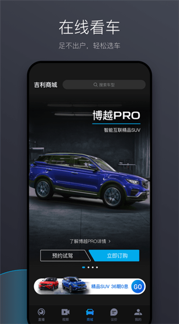 吉利商城app,包含商城、发现、视频号、议价、个人中心5大模块,是吉利商城在移动端的有力体现,为用户搭建了爱车选购、用车交流的平台。