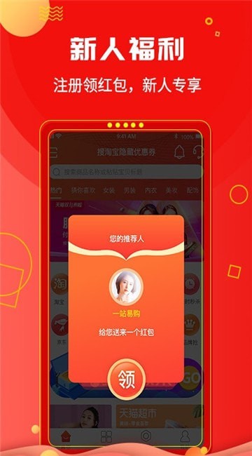 一站易购是专为人们所打造的一款赚钱省钱的购物软件,在这个应用中每日都会有淘宝、天猫、京东、拼多多的上万优惠券进行更新,限时开抢,手快有手慢无。并且在这里领劵购物还会获得一定的超高返利优惠,非常的划算,绝对的购物省钱利器,在此软件中邀请好友进行下载app使用你的邀请码进行注册登录,当你的朋友进行购物时你就会获得一定的返利,非常的实惠,啥都不用做即可赚取诸多零花钱,并且新人诸多还可以有领红包的机会,喜欢的朋友赶快来下载使用吧。