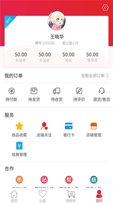 5、体验客户服务,商品收藏、店铺关注、银行卡管理、店铺管理、结算管理服务都有;
