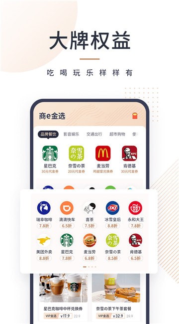 商e金选是一款为用户提供各类吃喝玩乐特价权益的产品,精选品牌咖啡、果汁奶茶、人气美食、娱乐出行等覆盖我们吃喝玩乐的各种会员特权,众多大牌权益低至一元起,品类丰富又实惠,满足你的日常生活所需!