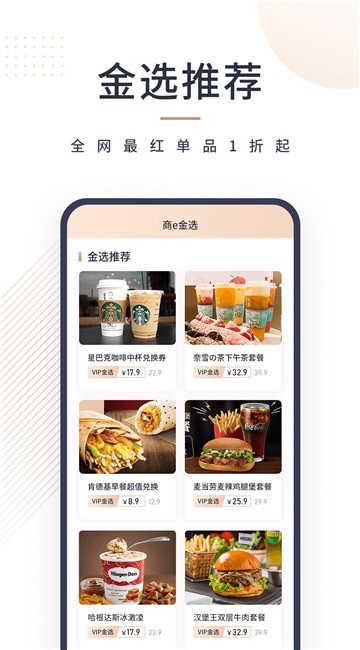 商e金选app提供全网潮人喜爱的人气美食、大牌咖啡、蛋糕甜品、奶茶等特价权益。