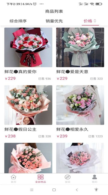 3、智能排序,全部鲜花商品可以根据综合、价格和销量高低进行智能排序;