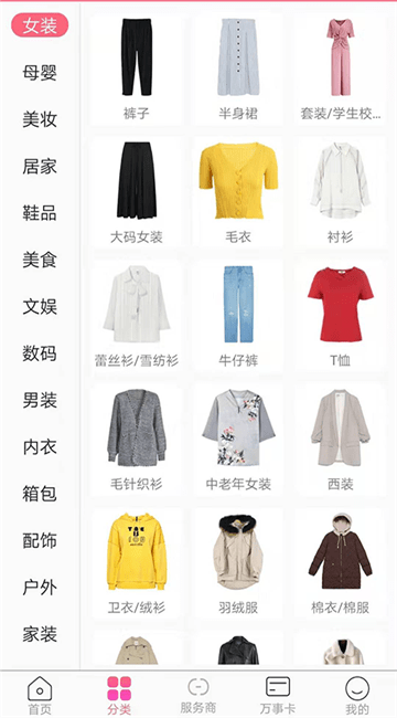 万事购物app包含了“首页”、“分类”、“万事卡”、“我的”四大界面。