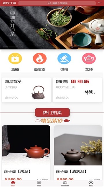 紫砂江湖app手机在线购物软件,该软件专注于紫砂壶产品的售卖,除此之外还有瓷器、茶叶、字画、茶道具、玉石、盆景、文玩等商品,同时还有壶友圈、微拍、艺师直播等服务,有需要的朋友快来单机8下载使用吧!