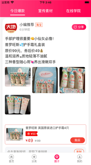 3、一键分享:在大地优品APP里找到您要分享的商品,分享至朋友圈等社交平台,朋友领券购买并无退货您将获得佣金。