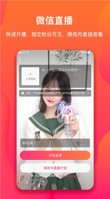 1、支持微信中快速开播,可以设置指定粉丝可见;