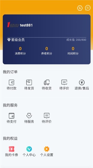 5、在个人中心,即可查看积分、订单、服务以及权益等信息