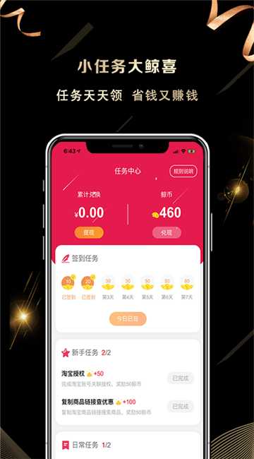 淘小鲸app是一款手机在线购物软件,在这里商品类型丰富,用户可以在线搜索想要选购的商品进行购物,用户在这里购物可享受返利,每天都有任务,帮助你省钱还能赚钱,有需要的朋友快来单机8下载使用吧!