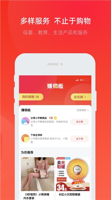 小市集致力于做全网母婴类商品和服务的供给,接入淘宝、天猫、京东、拼多多等平台海量优惠券,为用户随时随地提供购物、教育、餐饮、休闲娱乐及生活服务等领域的消费优惠,让用户在社交中分享优惠,享受高额佣金奖励。