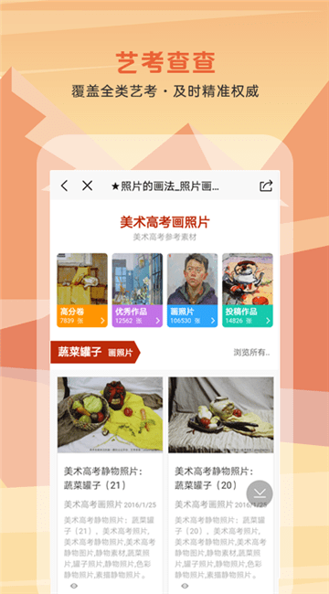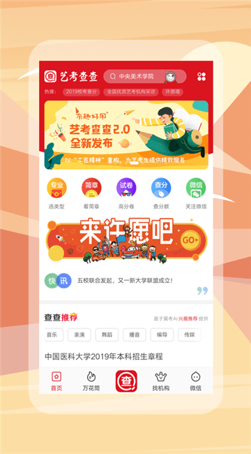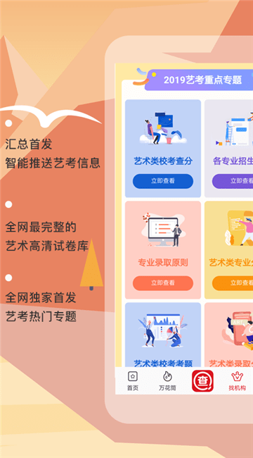 最好用的招考信息查询工具,覆盖600多所艺术大学,与学校招生信息实时同步,支持分地区、专业、文化分、考点查询,一目了然的分省计划、报考步骤、历届文化分参考、历届校考试题!