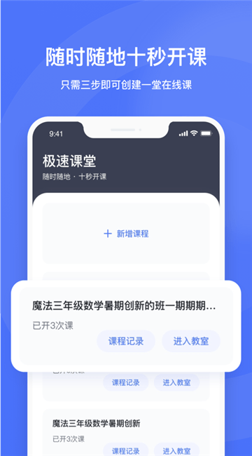 直播云老师端手机客户端是一款在线学习教育软件,用户可以随时随地十秒开课,只需三步就可以创建一堂在线课,一键邀请学生上课,学生通过分享的链接直接进入在线教室上课学习,高清流畅直播课堂,多样化互动高度还原真实教室,直播课结束后还可以随时查看回放,有需要的用户快来下载使用吧!