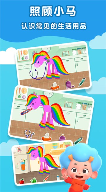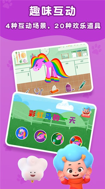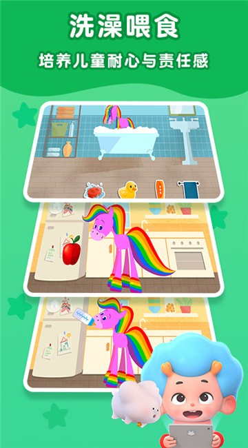 彩虹马的一天app是一款帮助孩子培养责任感的应用,以2-4岁的小朋友为服务对象,通过照顾彩虹马的方式进行耐心培养,提升共情能力;其中包含四种不同的互动场景,多达20个有趣的活动道具,丰富活动画面,轻松实现能力培养;在学会照顾彩虹马的同时,认识生活中的常见用品,如厨房用品、家用电器等,多种类常见用品都能轻松掌握名称;帮助彩虹马洗澡、喂食等,轻松实现耐心培养,非常有利于之后的学习生涯,更有耐心的研究不会的习题,弄懂不会的知识点;在与彩虹马趣味互动时,进行社交技能培养,认识更多小伙伴,进行趣味社交。