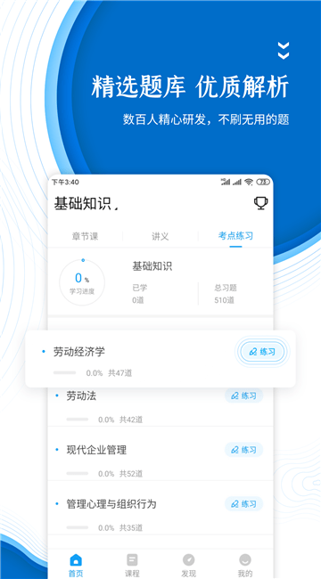 1、打开安装好的人力资源师准题库app即可进入到学习界面