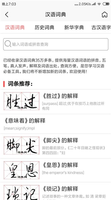词典网免费版是专门为国学爱好者打造的掌上学习帮手,集书法字典、历史词典、古汉语字典、成语词典、新华字典等多部字典于一身,提供全维度成语学习和书法学习帮助;无论你喜欢行书、楷书、还是草书、篆书,都有提供相应的书法学习内容,手把手教您学好书法,进行书法练习;几乎每一个简体字都能查询到相应的书法字写法,从而更好的进行书法练习;近义词、反义词、好词好句、百家姓、周公解梦等领域的学习内容也有带来,资料非常丰富,满足所有爱好者的国学学习需求,能够系统学习相关知识,传承历史文化。