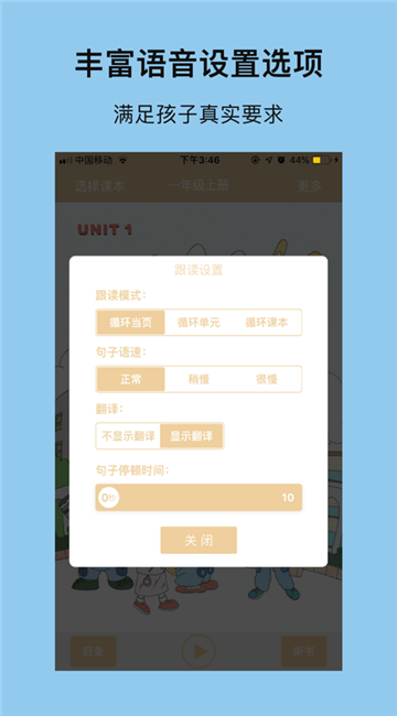 1、跟读模式:循环当页、循环单元、循环课本