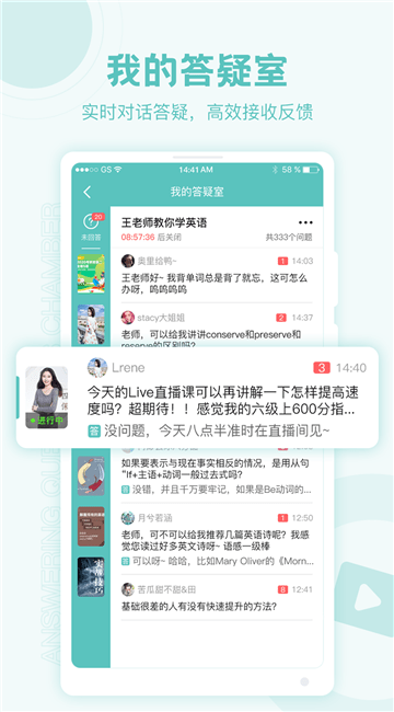 支持实时的一对一或一对多的在线答疑,提前和老师约定时间,老师发起课堂后,学生会收到通知,在规定的时间进入即可和老师进行现场互动。