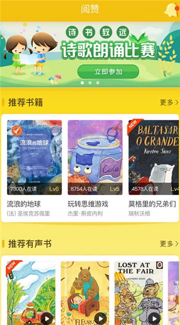 阅赞最新版是一款阅读学习教育软件,在这里用户可以通过阅读各种书籍和有声读物来培养自己的阅读综合能力,在这里所有的用户都能在线进行阅读综合能力测评,想要阅读学习科普百科、童话寓言、历史传记、传统文化、经典名著等,快来单机8下载使用吧!