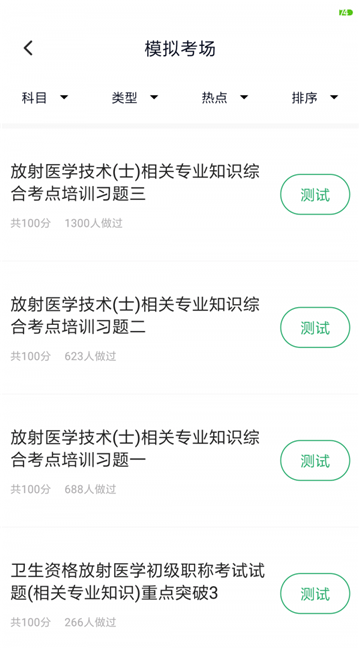 3、模拟考场自主筛选,在全部模拟考场中可以按照科目、类型和热点筛选考场;