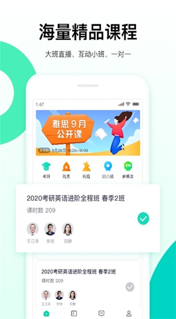 新东方出国考试手机版是一款出国考试的专门备考应用,是新东方旗下的线上教育平台,能够同时为学习者提供雅思、托福以及GRE、GMAT、SAT和日语、考验、四六级等全类型的英语线上课堂,课堂之中汇聚了课程,每门课程都有名师在线讲解,用户可以选择直播课程以及公开课,值得一提的是,这里创建了小班授课模式,用户可以在线报班与其他人在线实时学习互动,有利于提升自我备考的效率,非常不错。而且,这个出国考试的备考app不仅有着课程而且对应的题库这里也有,海量题库随意切换,能够在此随时的练题,想要提升自己成绩的话就下载吧。
