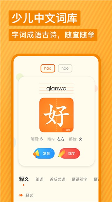 汉字笔顺:汉字全部配置笔顺动图及跟写练习,并为每一个汉字录入真人发音,为儿童带来多感官学习体验。