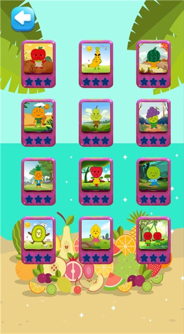 6、进行闯关学习,在关卡中需要准确说出水果名称,并进行水果拼图;