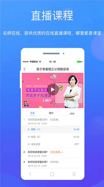 直播开课功能,直播课堂随时开随时听,可一对一,也可以是公开课,方便而又省心