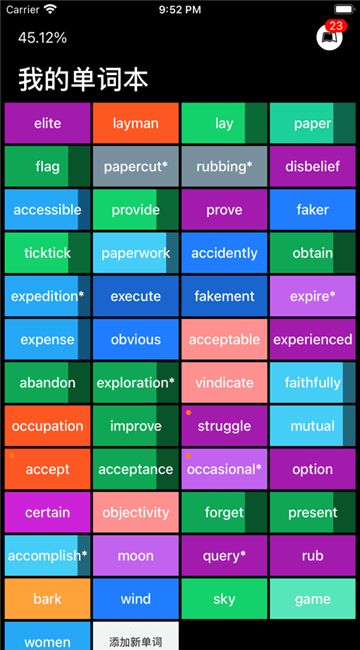 进入应用里,您会看见各个单词以不同的颜色显示在界面上。这就是“单词块”独创的色彩记忆系统。每一种颜色代表着您对这个单词的熟悉程度,而熟悉度由系统根据您的每一次学习状态由AI智能算法分析计算得出。您可以通过颜色块直观的了解到哪些单词自己比较熟悉或者陌生、哪些单词刚刚学过、哪些单词正处于遗忘时期需要尽快复习等。