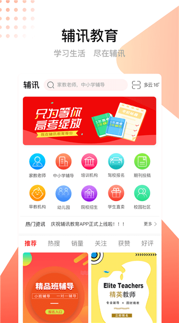 辅讯教育手机客户端是一款教育平台软件,涵盖了中小学网约家教老师,中小学课外辅导机构、职业培训机构以及其他各类院校的在线选择机构和在线付款报名,冬夏令营在线选择和下单付款,论文期刊投稿资讯,学生商城和交流社区等多项业务在内的一站式平台。交流社区主要提供交流论坛、免费练习题库、在线可以阅读文章、高校介绍、抢答有钱、视频专区、免费直播上课等业务。辅讯教育APP涵盖:家教线上预约、教育机构线上报名、期刊资讯、冬夏令营线上报名,学生用品商城,学生学习交流社区等多项与学生相关的业务在内的一站式学习平台,让学习更轻松。